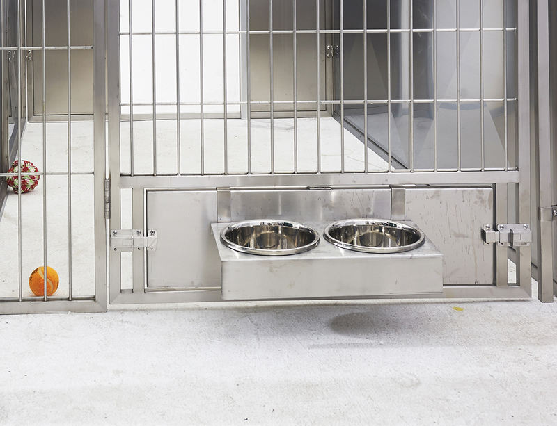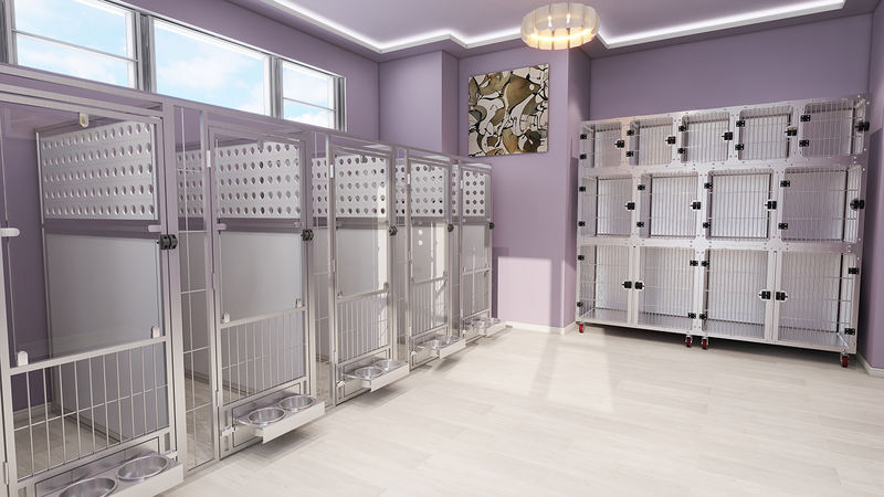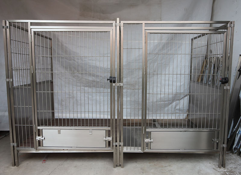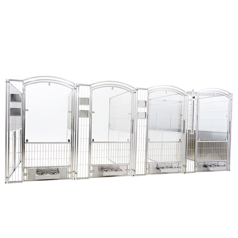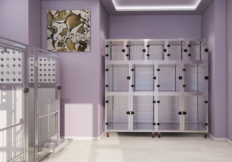 Lồng cách ly và nội trú động vật đa năng có khay đựng chất thải với các cạnh dốc ra ngoài và tấm chắn nước liền mạch để tránh rò rỉ nước tiểu. Lưới chỗ để chân sử dụng phương pháp hàn tần số cao để loại bỏ các mối hàn tách rời và bám bụi bẩn. Khóa cửa trượt tự động khóa chặt để ngăn thú cưng trốn thoát, với một số mẫu chọn lọc tích hợp hệ thống cửa khóa kép từ tính.